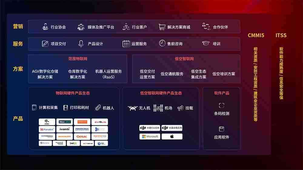聚合国内外先进的物联网硬件产品品牌,,聚焦数字化仓储、、、机器人运营、、低空智联网等领域,,,,共同打造适合客户业务场景的解决方案并提供交付服务